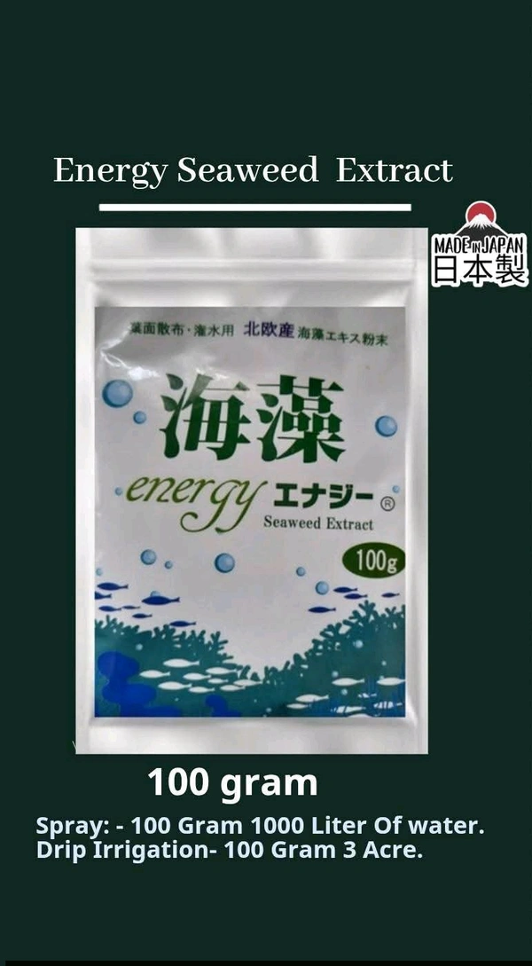 सीव्हीड एनर्जी वापरण्यास सोपी नैसर्गिक सीव्हीडपासून 100% पाण्यात विरघळणारी अर्क पावडर आहे जी पाण्यात सहज विरघळते. इतर खते आणि कीटकनाशके मिसळण्यासही हरकत नाही.