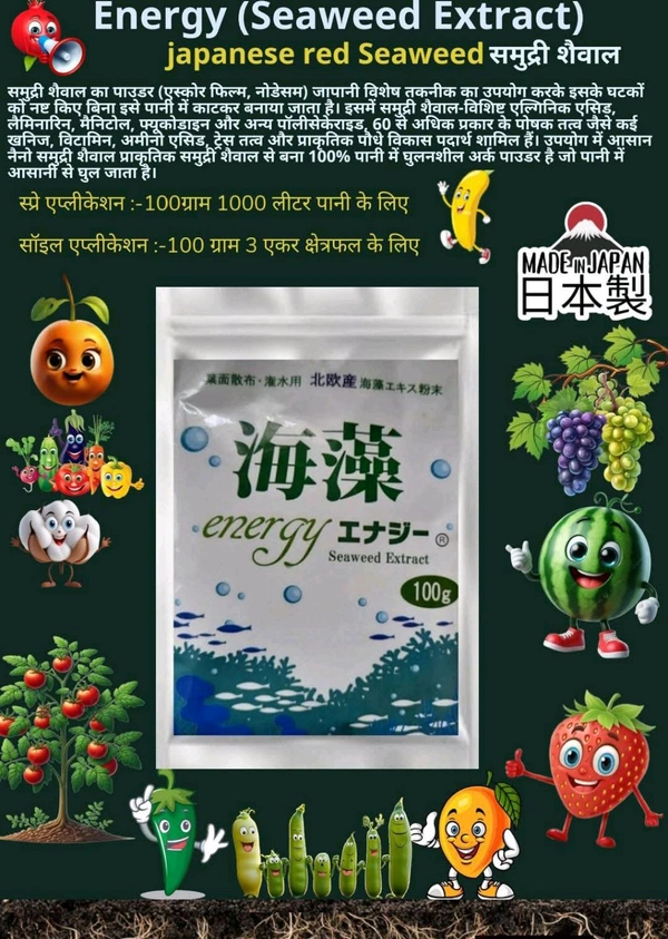 सीवीड एनर्जी प्राकृतिक समुद्री शैवाल से उपयोग में आसान 100% पानी में घुलनशील अर्क पाउडर है जो पानी में आसानी से घुल जाता है। अन्य उर्वरकों और कीटनाशकों के साथ मिलाना भी ठीक है।